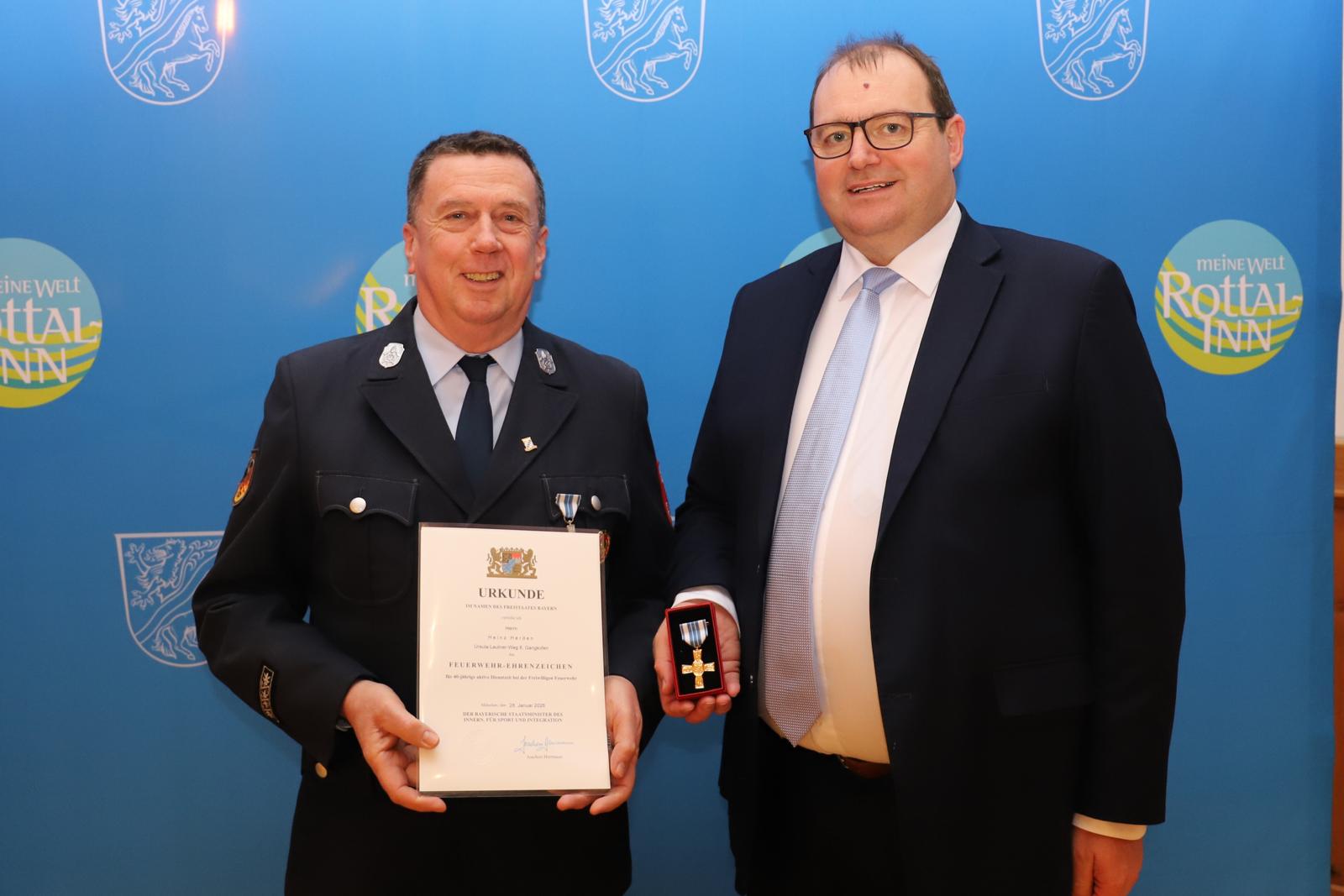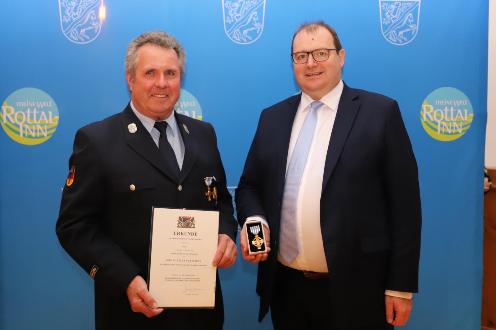 Unserem Vorstand Josef Thanner (50 Jahre Feuerwehrdienst) und ehemaligen Mannschaftssprecher Heinz Herden (40 Jahre Feuerwehrdienst) wurde das Abzeichen dabei jeweils durch Landrat Michael Fahnmüller überreicht, ebenfalls unter den Gratulanten waren Kreisbrandrat René Lippeck, Kreisbrandinspektor Andreas Maurer, Kreisbrandmeister Tobias Ertl und stellvertretender Kommandant Uli Hubauer, sowie von Seiten der Gemeinde Bürgermeister Matthäus Mandl.