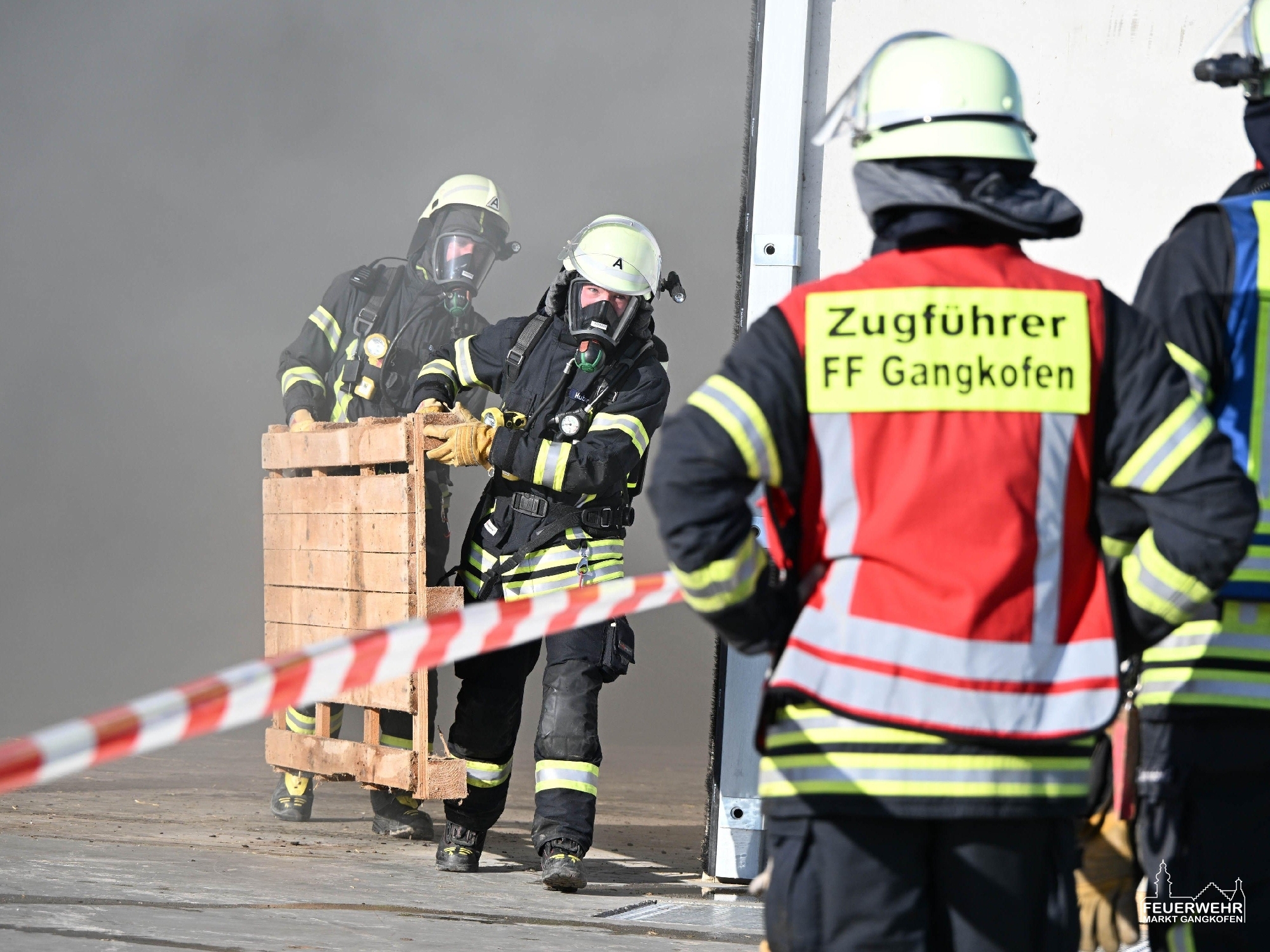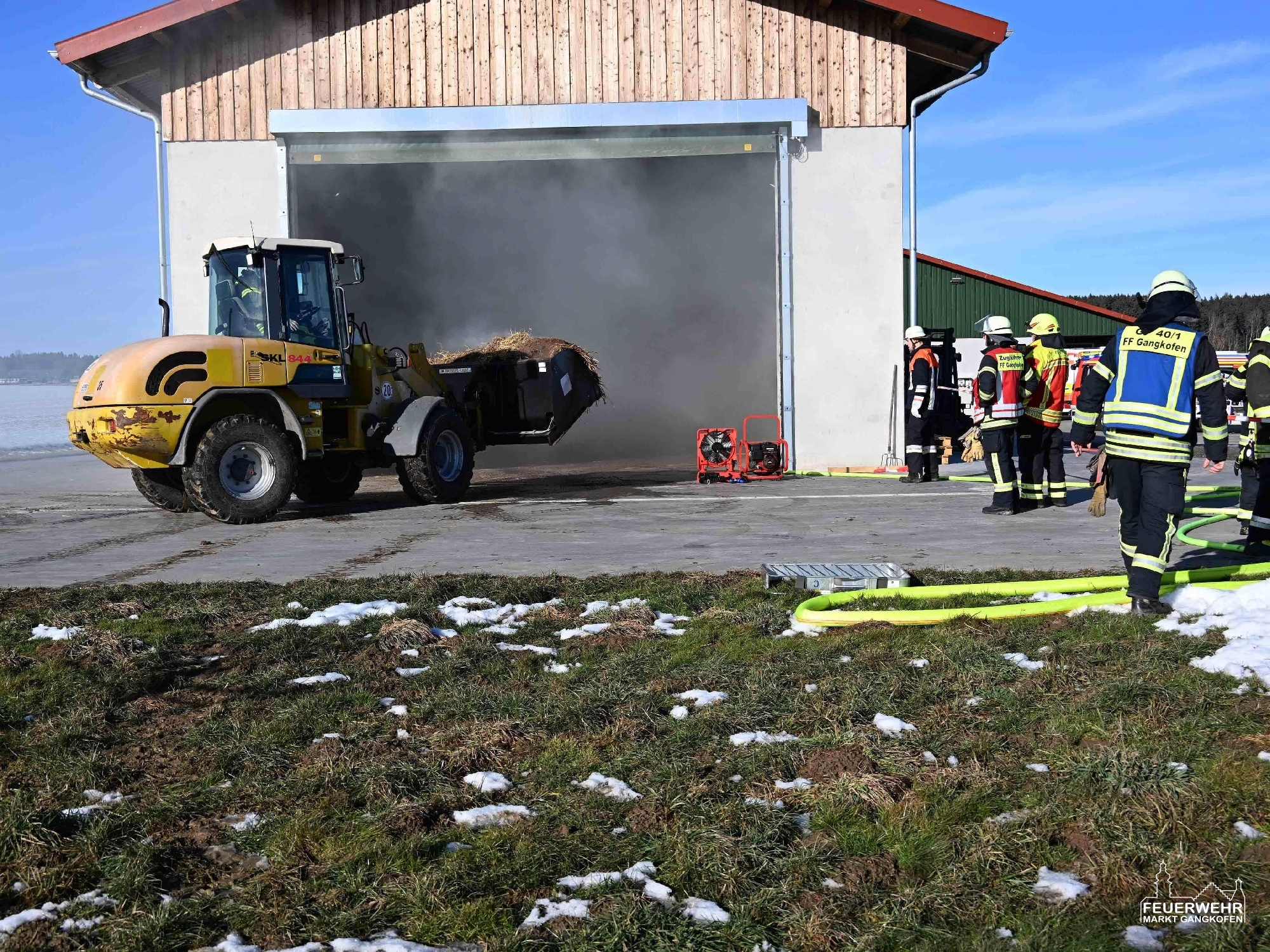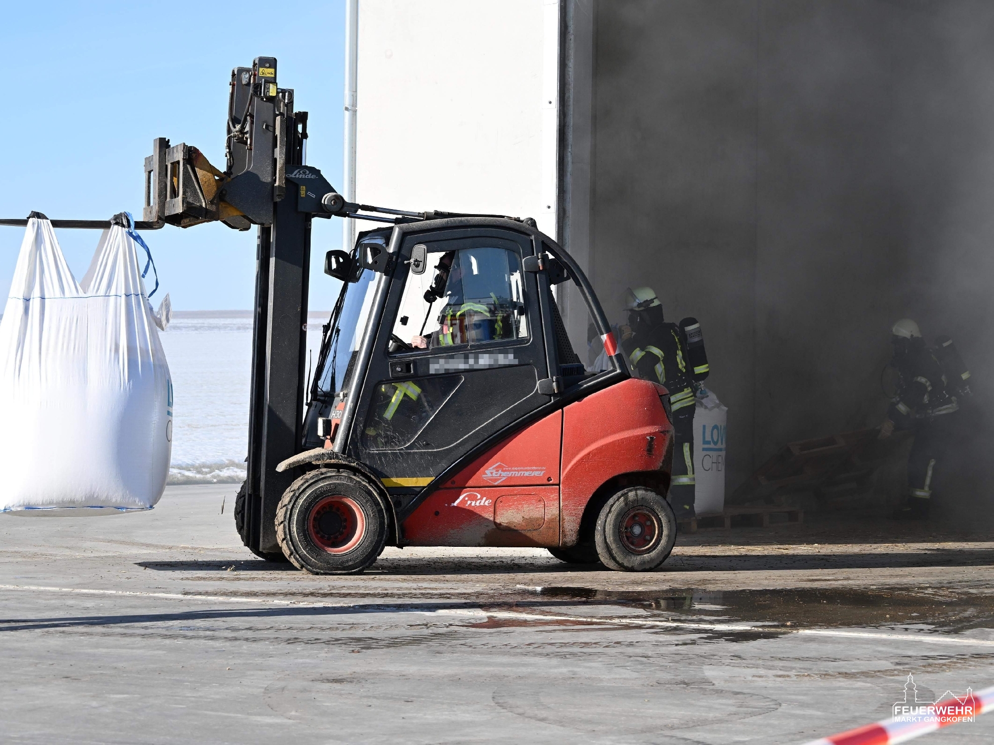 Um ein vollständiges Ablöschen zu ermöglichen, wurde die komplette Halle mit einem Radlader ausgeräumt und das Brandgut ins Freie verbracht, wo es gezielt abgelöscht werden konnte.